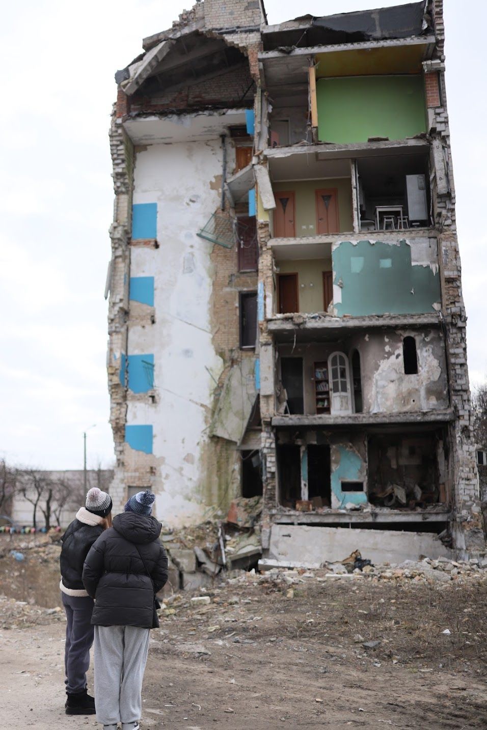 Borodianka is one of these towns in the Bucha region of Kyiv oblast, 30 miles Northwest of the capital, Kyiv. Most people in Borodianka owned farms, with many animals and large areas of cultivated land. Despite humanitarian corridors being established, it is unclear how many managed to escape. Roads into and out of the town are littered with burnt out cars and vehicles. Borodianka was heavily shelled by Russian rockets on 1st of March 2022 and as a result, eight large apartment buildings were completely destroyed and many people were killed. When the apartment blocks were hit by rockets, locals wanted to launch a rescue operation to find people who were buried under the rubble, both those buried alive and the dead. The Russian soldiers refused to allow anyone to dig through the rubble, or even to bury the dead. It wasn’t until the Borodianka was liberated by the Ukrainian military that the locals were able to search for the bodies of those who had died in the destroyed buildings. This meant that even those who survived the shelling, died under the rubble.